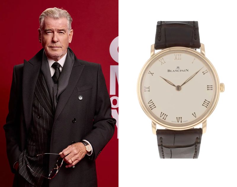 Pierce Brosnan, an Irish actor and film producer, wears a Blancpain Villeret Ultra Slim Ref. 6605-3642-55A.