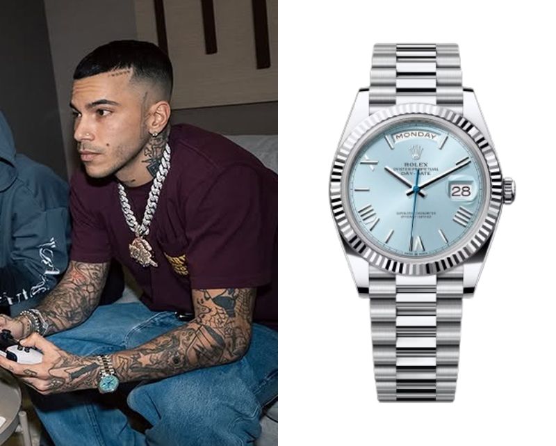 Sfera Ebbasta’s Watch November 26, 2025 Sfera Ebbasta, an Italian rapper, wears a Rolex Day-Date Ref. 228236-0021.