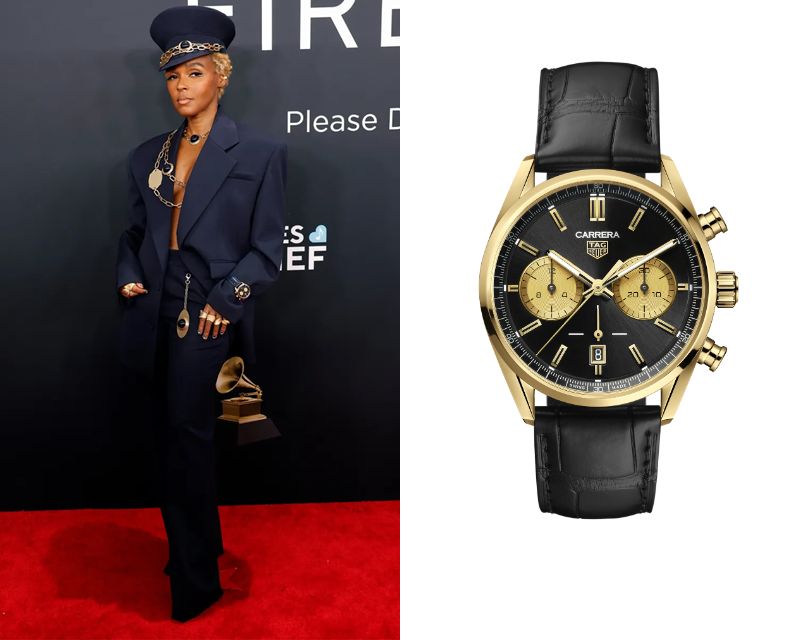 Janelle Monáe, an American singer, songwriter, and record producer, wears a TAG Heuer Carrera Chronograph 42 mm Ref. CBN2044.FC8313.