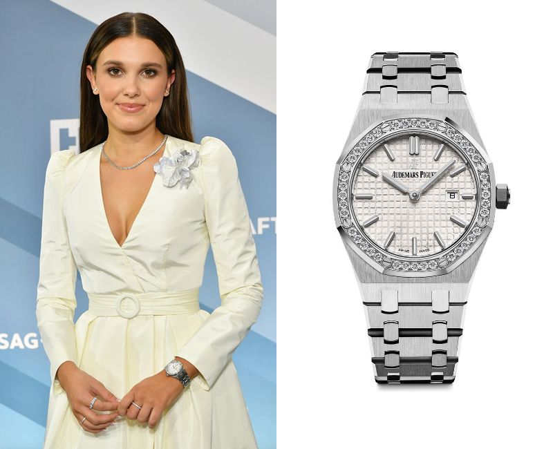 Millie Bobby Brown’s Watch December 29, 2025 Millie Bobby Brown, a British actress, wears an Audemars Piguet Royal Oak Quartz Ref. 67651ST.ZZ.1261ST.01.