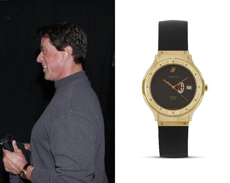 Sylvester Stallone, an American actor, wears a Hublot MDM Classic customized with the AC Milan emblem.