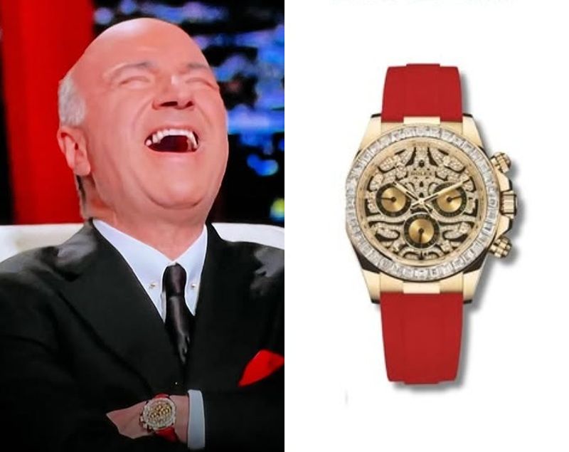 Kevin O’Leary, a Canadian businessman and television personality, wears a Rolex Cosmograph Daytona Yellow Gold Diamond Oysterflex Ref. 116588TBR-0003 Eye of the Tiger.