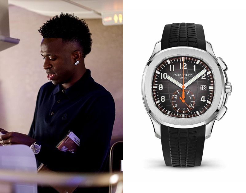 Vinícius Júnior, a Brazilian footballer, wears a Patek Philippe Aquanaut Chronograph Ref. 5968A-001.