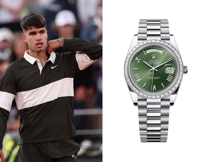 Carlos Alcaraz’s Watch – Part 5 January 10, 2026 Carlos Alcaraz, a Spanish professional tennis player, wears a Rolex Day-Date 40 Platinum Olive Green Dial with Diamond Bezel Ref. 228396TBR. Carlos Alcaraz’s WatchCarlos Alcaraz’s Watch – Part 2Carlos Alcaraz’s Watch – Part 3Carlos Alcaraz’s Watch – Part 4