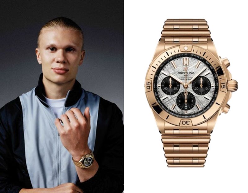 Erling Braut Haaland, a Norwegian footballer, wears a Breitling Chronomat B01 42 Erling Haaland Limited Edition Ref. RB01347A1F1R1.