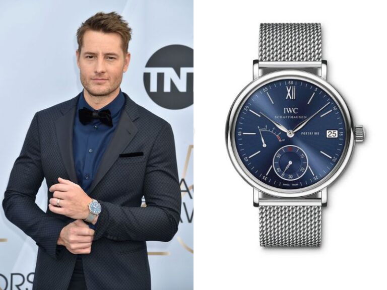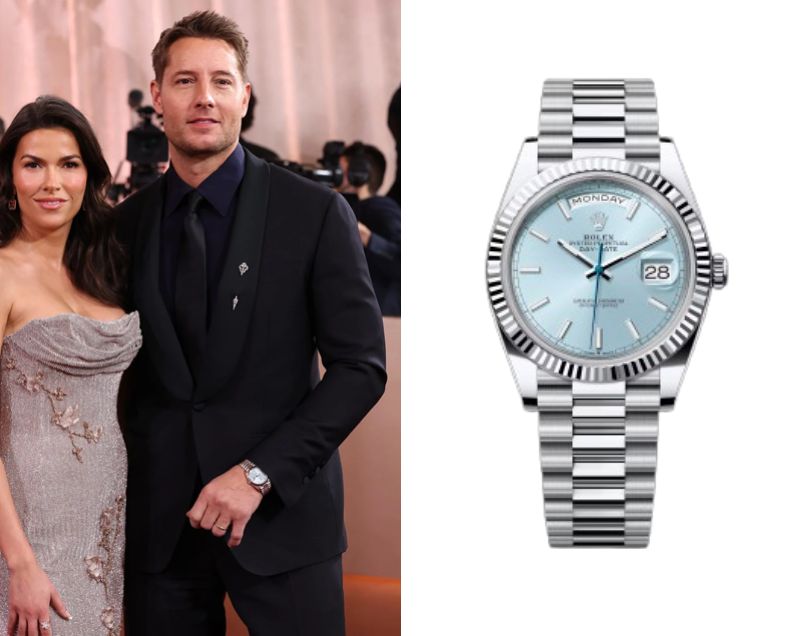 Justin Hartley, an American actor, wears a Rolex Day-Date Platinum Ice Blue Dial Ref. 128236A.