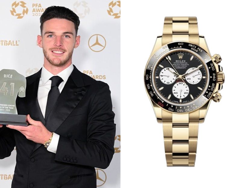 Declan Rice, an English footballer from London, wears a Rolex Daytona Ref. 126528LN.
