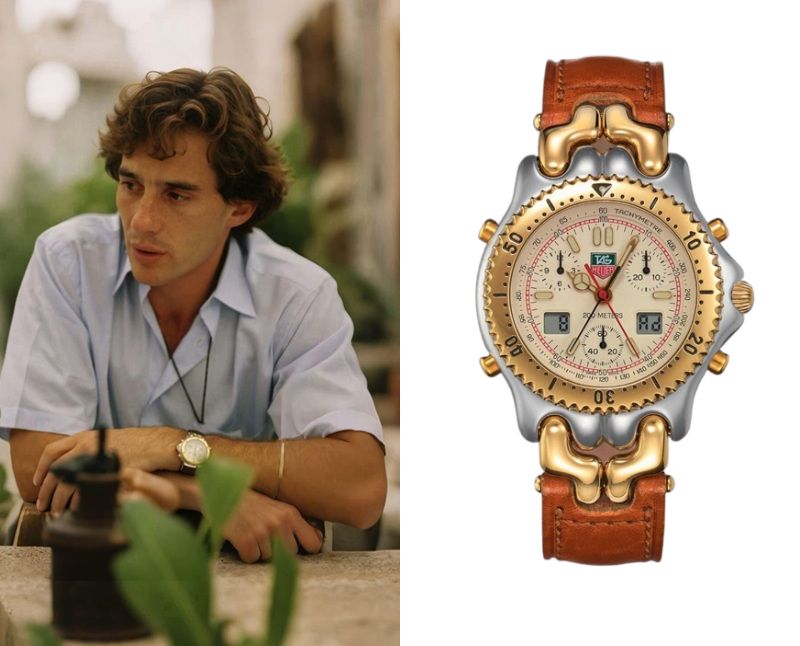 Ayrton Senna, a Brazilian racing driver, wears a TAG Heuer Split Seconds Chronograph.