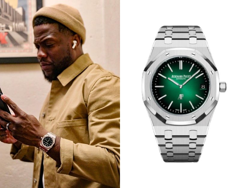 Kevin Hart, an American actor, wears an Audemars Piguet Royal Oak Jumbo Extra-Thin Ref. 15202PT.