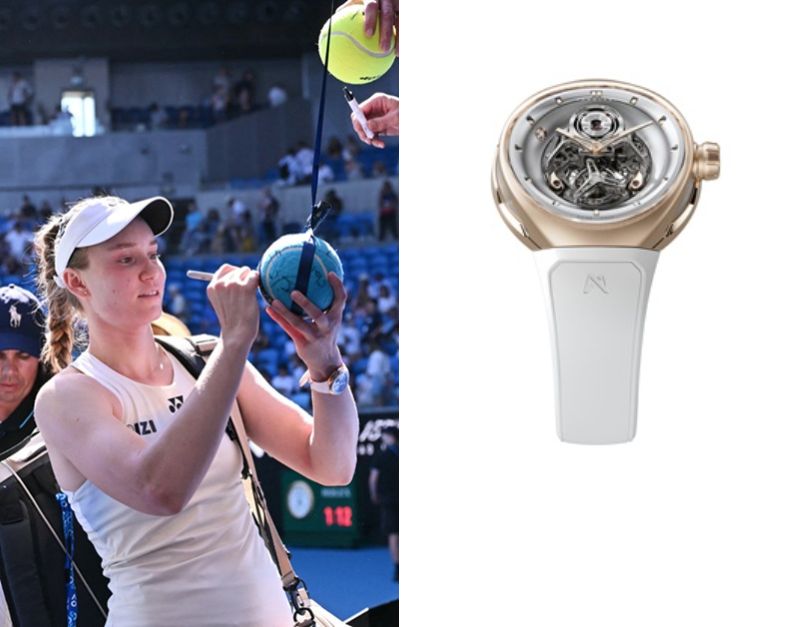 Elena Rybakina, a Kazakhstani female tennis player, wears a Vanguart Orb Flying Tourbillon Ref. 11001-002.