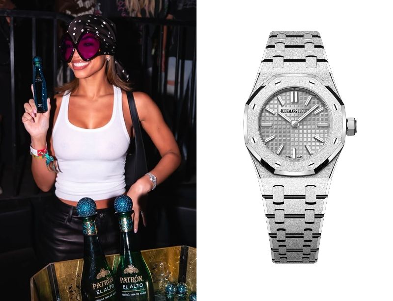 Lori Harvey, an American model, wears an Audemars Piguet Royal Oak Mini Frosted Gold Quartz Ref. 67630BC.GG.1312BC.01.