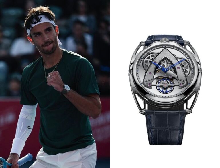 Lorenzo Musetti, an Italian professional tennis player, wears a De Bethune DB28XS Yellow Tones.