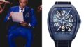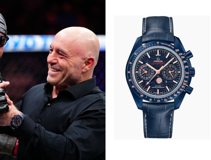 Joe Rogan, an American podcast host, wears an Omega Speedmaster Blue Side of the Moon Aventurine Dial Ref. 30493445203002.