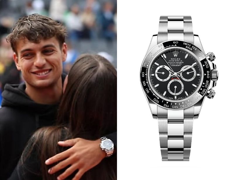 Flavio Cobolli, an Italian professional tennis player from Florence, Tuscany, wears a Rolex Cosmograph Daytona Ref. 126500LN.