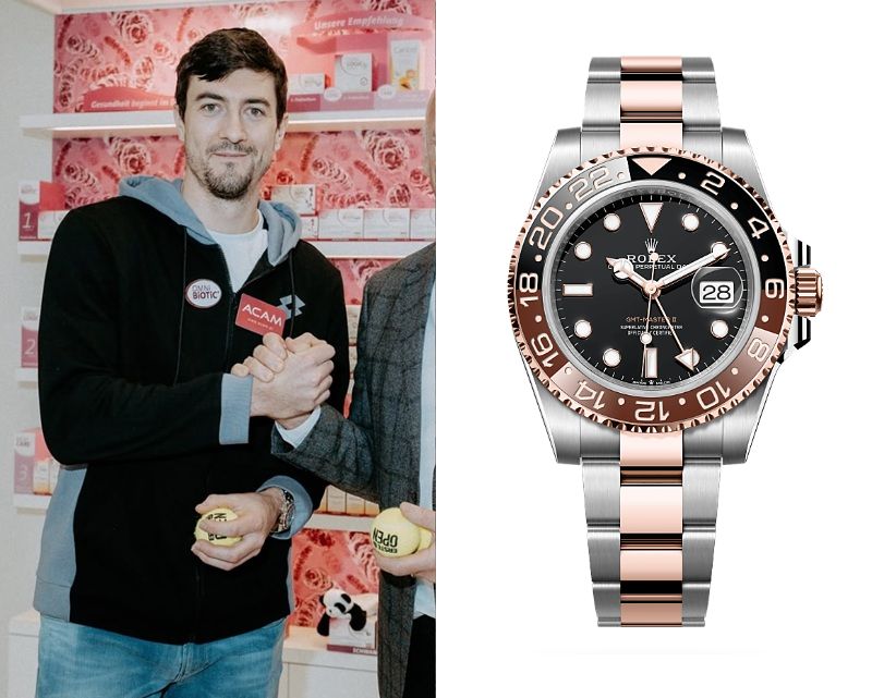 Sebastian Ofner, an Austrian professional tennis player, wears a Rolex GMT-Master II Oystersteel and Everose gold Ref. 126711CHNR.