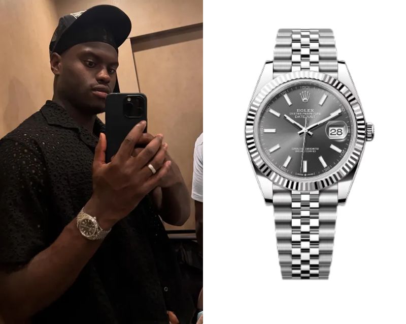 Benoit Badiashile, a professional footballer from Limoges, France, wears a Rolex Datejust 41 Ref. M126334-0014.