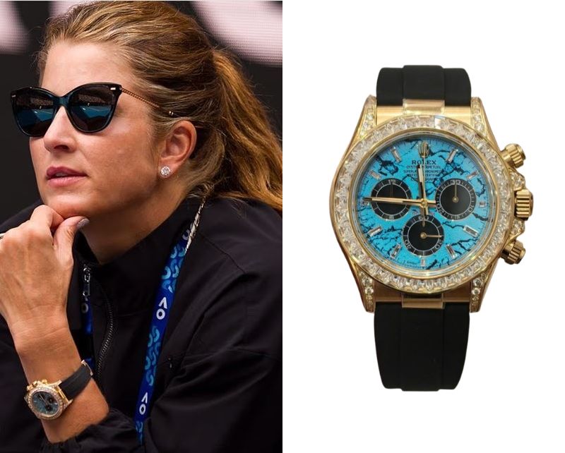 Mirka Vavrinec, a Swiss former professional tennis player, wears a Rolex Cosmograph Daytona Ref. 116519 Beach Turquoise Blue.