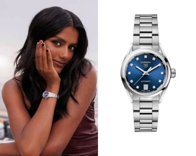 Simone Ashley, a British actress, wears an IWC Ingenieur Automatic 35 Ref. IW324903.