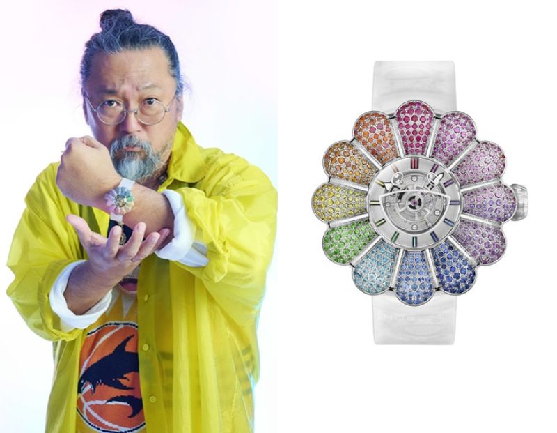 Takashi Murakami, a Japanese contemporary artist, wears a Hublot MP-15 Takashi Murakami Tourbillon Sapphire Rainbow.