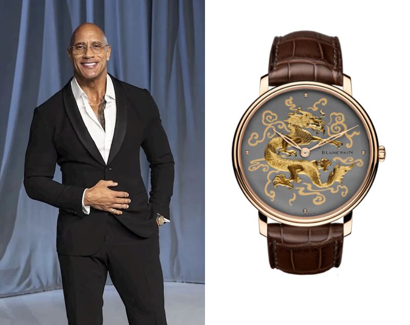 Dwayne Johnson, an American actor, wears a Blancpain Villeret Damascus Ref. 6615A-3612-55B.