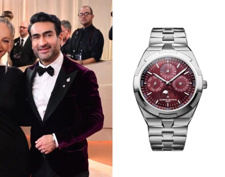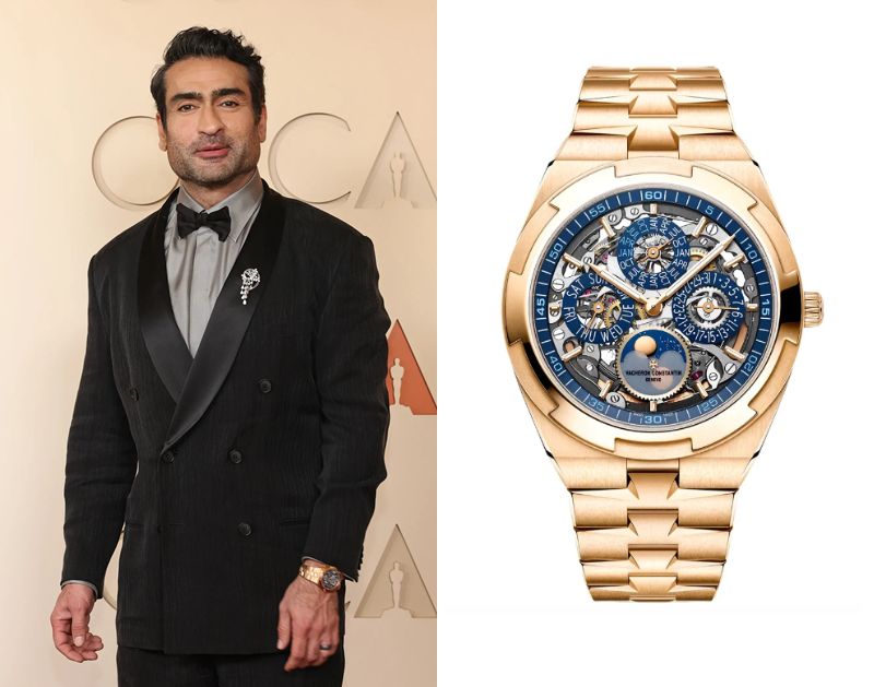 Kumail Nanjiani, a Pakistani-American actor and comedian, wears a Vacheron Constantin Overseas Extra-Thin Perpetual Calendar Skeleton Ref. 4300V/120R-B642.