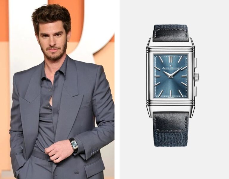 Andrew Garfield, an American actor, wears a Jaeger-LeCoultre Reverso Tribute Duoface Calendar Ref. 3912530.