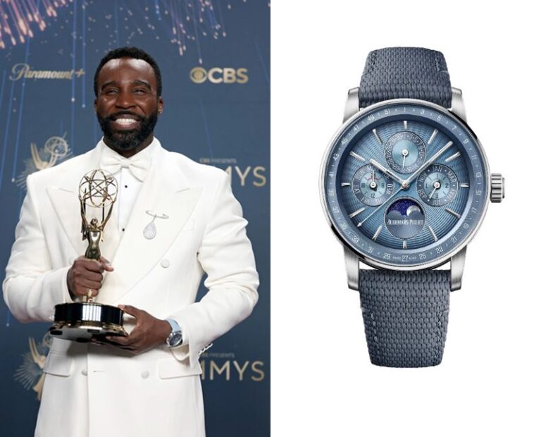 Tramell Tillman, an American actor, wears a Jaeger-LeCoultre Reverso Tribute Duoface Tourbillon Ref. Q392242J.
