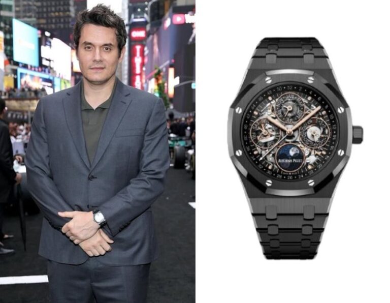 John Mayer, an American singer-songwriter and guitarist, wears an Audemars Piguet Royal Oak Perpetual Calendar Skeleton Ref. 25829ST.OO.0944ST.01.