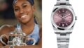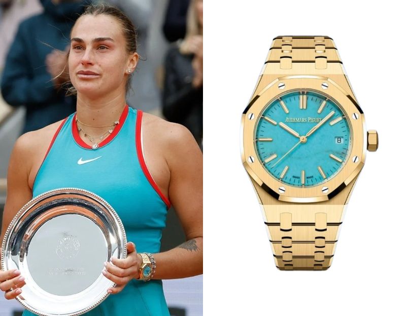 Aryna Sabalenka, a professional tennis player from Minsk, Belarus, wears an Audemars Piguet Royal Oak Selfwinding Yellow Gold with Turquoise Dial Ref. 15550BA.