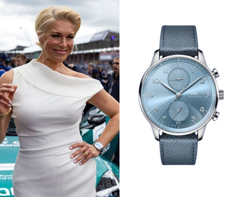Hannah Waddingham, a British actress, singer, and presenter, wears an IWC Portugieser Chronograph White Gold Ref. IW371626.