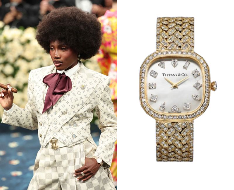Doechii, an American rapper, wears a Tiffany & Co. Tiffany Eternity Watch Yellow Gold with Diamonds and MOP Dial.