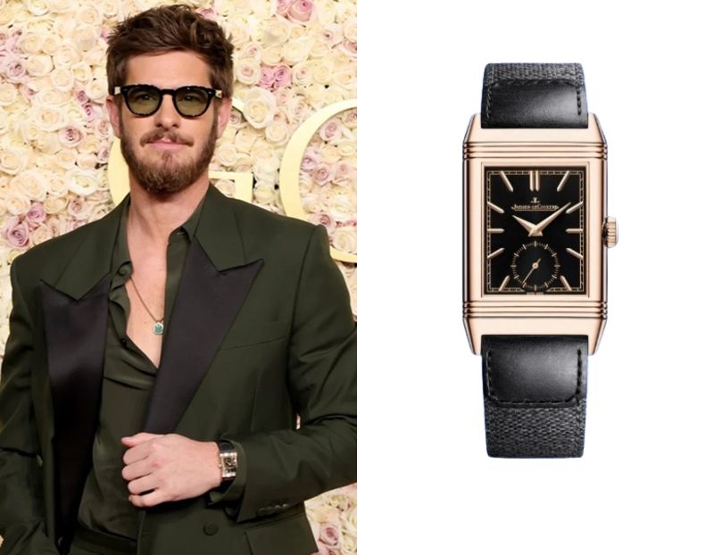 Andrew Garfield, an American-born British actor, wears a Jaeger-LeCoultre Reverso Tribute Monoface Small Seconds Pink Gold Ref. Q713257J.