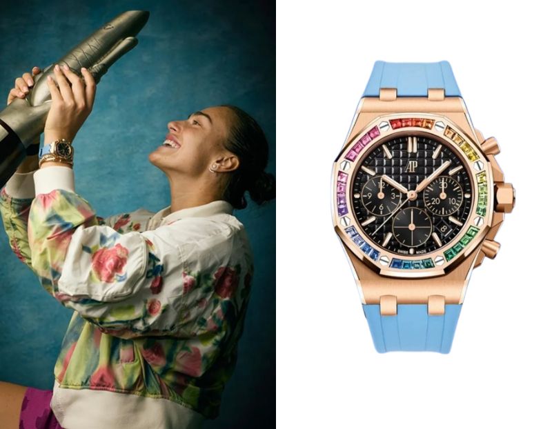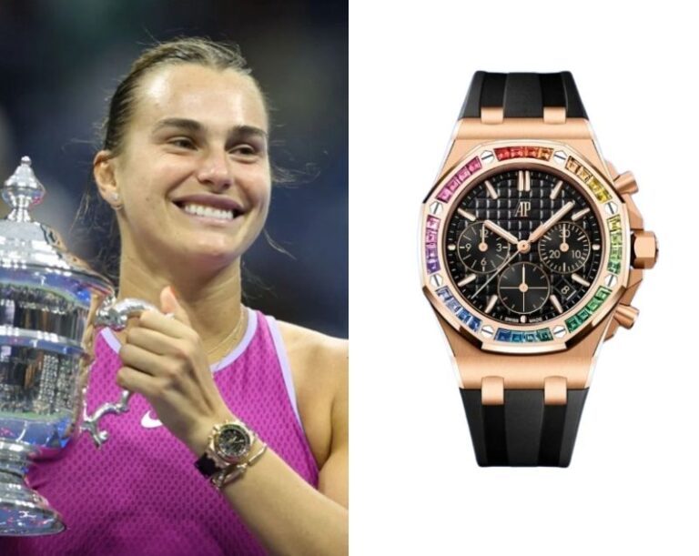 Aryna Sabalenka’s Watch – Part 2 October 6, 2025 Aryna Sabalenka, a Belarusian professional tennis player from Minsk, wears an Audemars Piguet Royal Oak Offshore Lady Chronograph Rose Gold Rainbow Black Dial Ref. 26236OR.YY.D002CA.01. Aryna Sabalenka’s WatchAryna Sabalenka’s Watch – Part 3