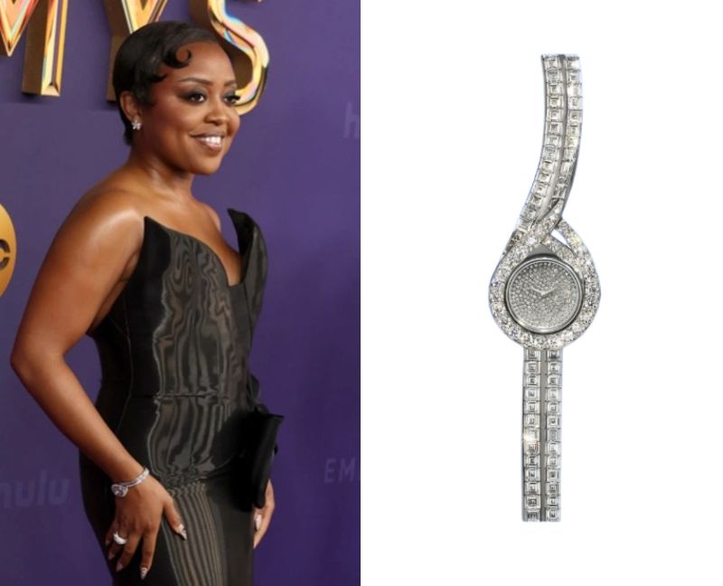 Quinta Brunson, an American actress and comedian, wears a Tiffany & Co. Blue Book 2002 Botanica White Gold Diamond Watch.