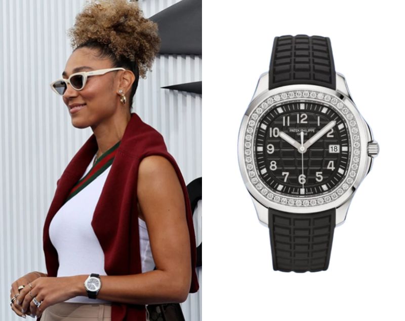 Ally Love’s Watch October 8, 2025 Ally Love, an American fitness instructor, wears a Patek Philippe Aquanaut Luce Steel with Diamonds 38.8mm Ref. 5267/200A-001.
