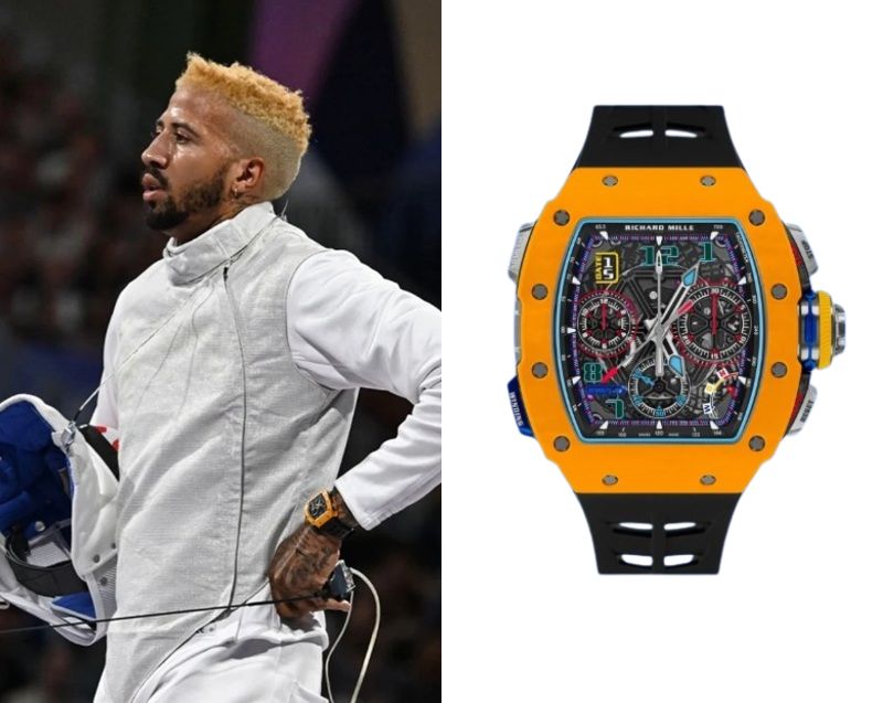 Miles Chamley-Watson, a British-American foil fencer, wears a Richard Mille RM 65-01 Automatic Winding Split-Seconds Chronograph Dark Yellow Quartz TPT.