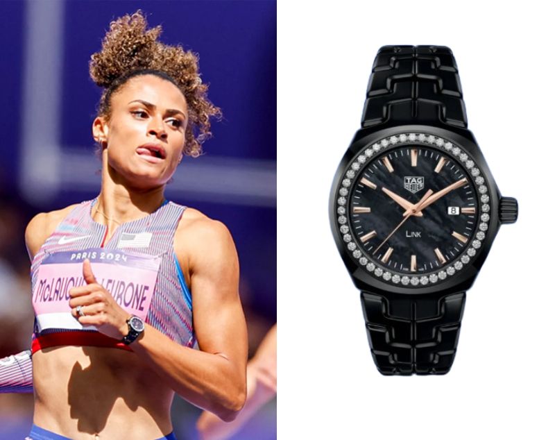Sydney McLaughlin-Levrone’s Watch October 9, 2025 Sydney McLaughlin-Levrone, an American track and field athlete, wears a TAG Heuer Link Ceramic with Diamonds 32mm Ref. WBC1390.BH0744.