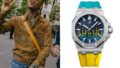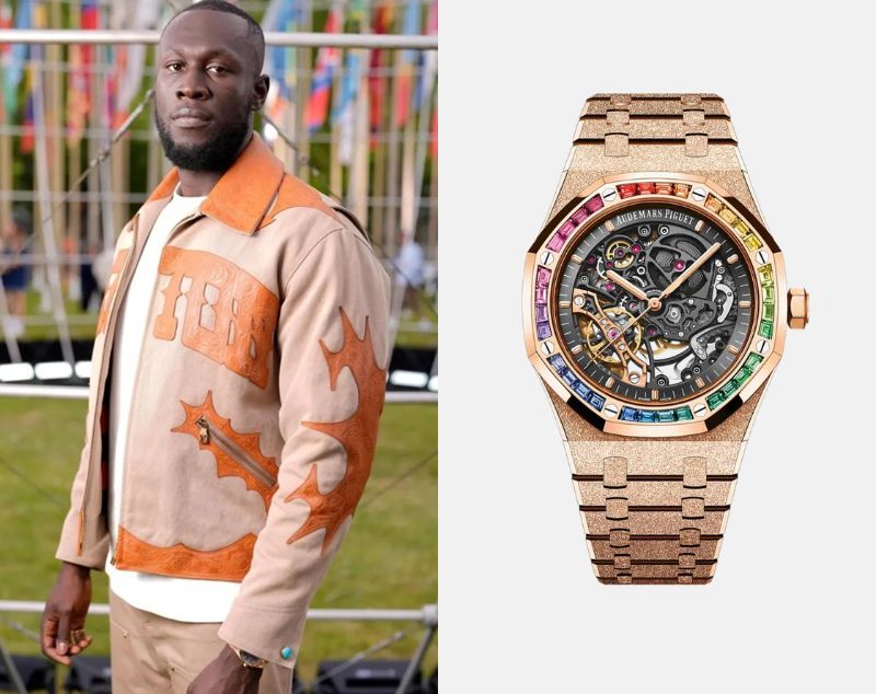 Stormzy, a British rapper, wears an Audemars Piguet Royal Oak Frosted Gold Double Balance Wheel Openworked with Baguette-cut Rainbow Gemstones Ref. 154120R.YG.12240R.01-B.