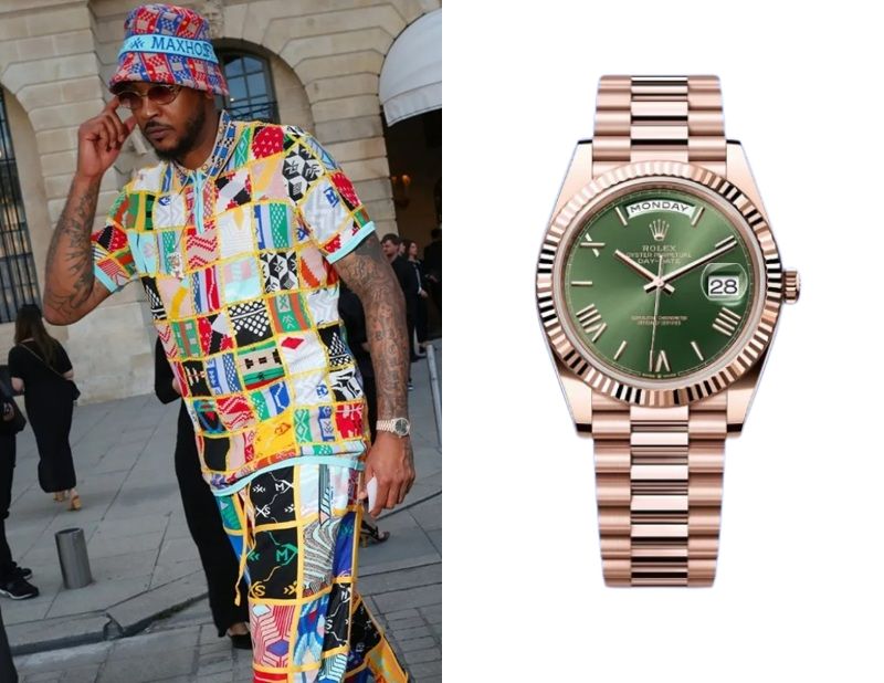 Carmelo Anthony’s Watch October 22, 2025 Carmelo Anthony, a former American professional basketball player, wears a Rolex Day-Date 40 Everose Gold Ref. 228235-0025.